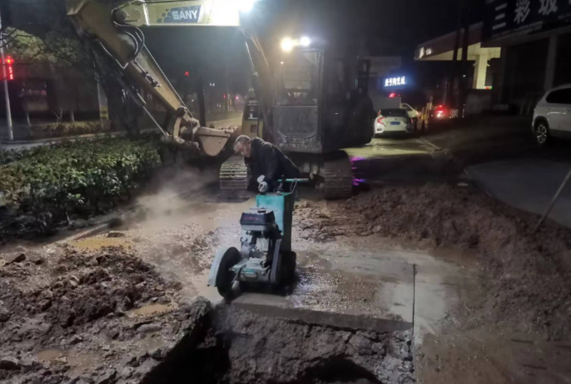 2月6日晚22时许,水司工作人员在日常巡查过程中发现五里加油站附近水管疑似破裂,专班人员立即联系维修人员前往现场查看具体情况,并尽快采取措施解决问题。现场经过判定,确定是由于温度骤降导致的DN150主管破裂,涉及整个五里周边区域居民的用水安全。得知这一情况后,松兹水司立即启动供水抢修应急预案,并在宿松供水网、公众号、朋友圈内及时发布紧急停水通知,提醒居民做好储水准备。抢修现场,气温零下,天空中还飘着雪花,抢修人员顶着刺骨的寒风,在阴暗潮湿的地底下争分夺秒地挖管道、抽积水、清淤泥,找到破损的管道并进行更换。浸满污水的衣服和手套早已湿透,工人们的脸也被冻得麻木通红,但一想到马上能恢复五里区域居民的正常用水,心里也就暖暖的。