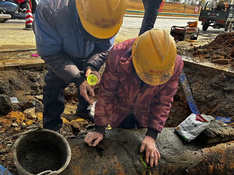 由于该区域位于高速桥洞下方,且地下密布国防光缆、通讯电缆,不便用机械开挖,维修难度极大。县水司主要负责人迅速组织技术人员现场会商抢修方案,并决定采取人工开挖的方式进行抢修。由于破损管道一时无法止水,致使抢修滞后。为尽快恢复通水,采用了多种方案进行修复,但由于破损管道与地下其他管线之间距离太近,各种方案均以失败告终。此次管道破裂导致县城高位区域用户水压、水量出现短暂不足现象。县水司心系群众饮水安全,所有抢修人员在岗20多小时,争分夺秒,昼夜不停,丝毫不敢懈怠的进行抢修,最终采取先用堵漏王止水再在破裂管道四周焊接起“铁帽子”的方式成功修复了水管。