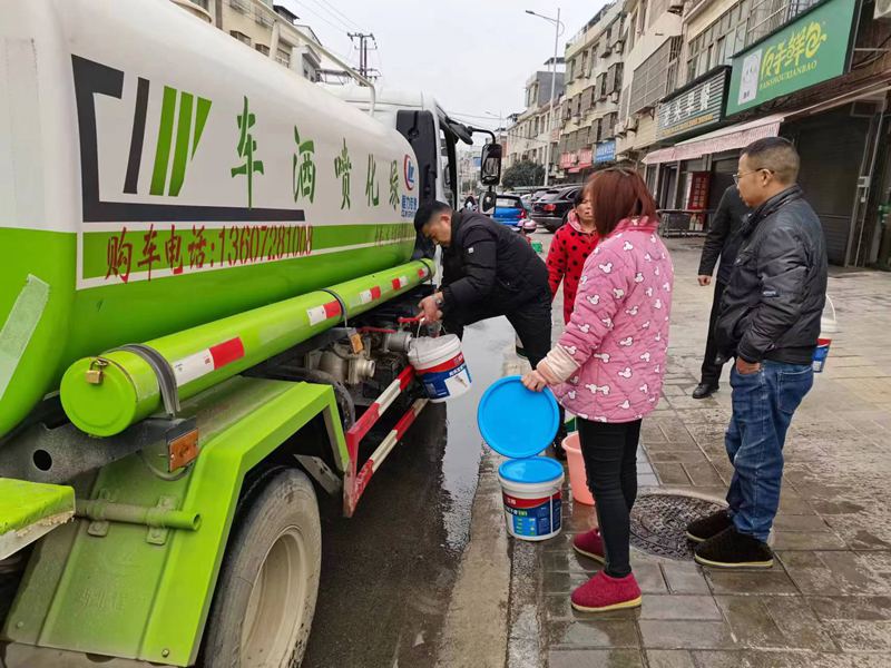 县水司为保障附近居民正常用水,利用洒水车将水送到居民门口,各户纷纷带着桶、盆、锅等各种器皿前来接水。