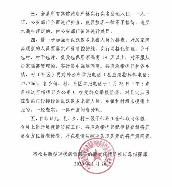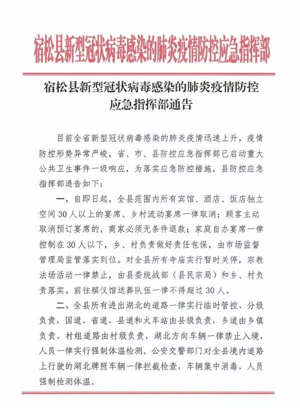 宿松县新型冠状病毒感染的肺炎疫情防控应急指挥部通告