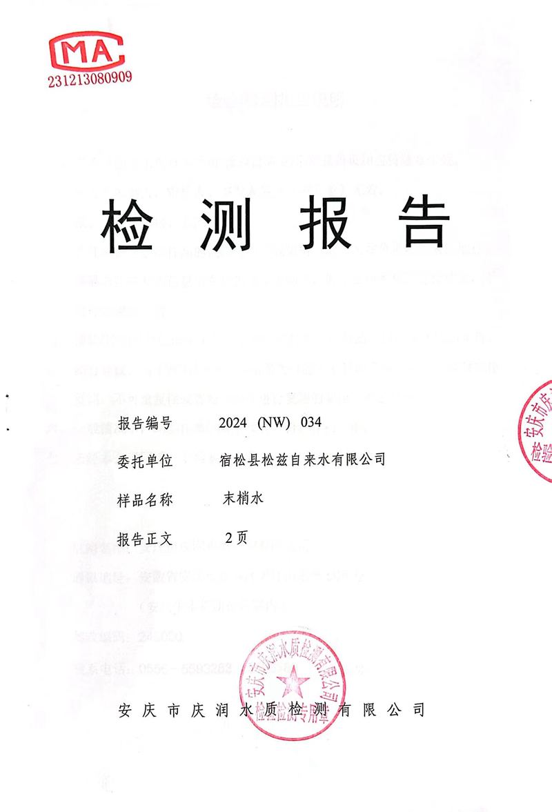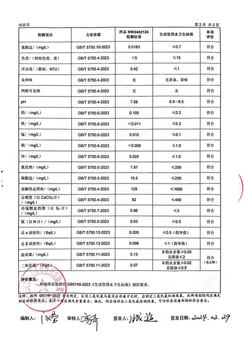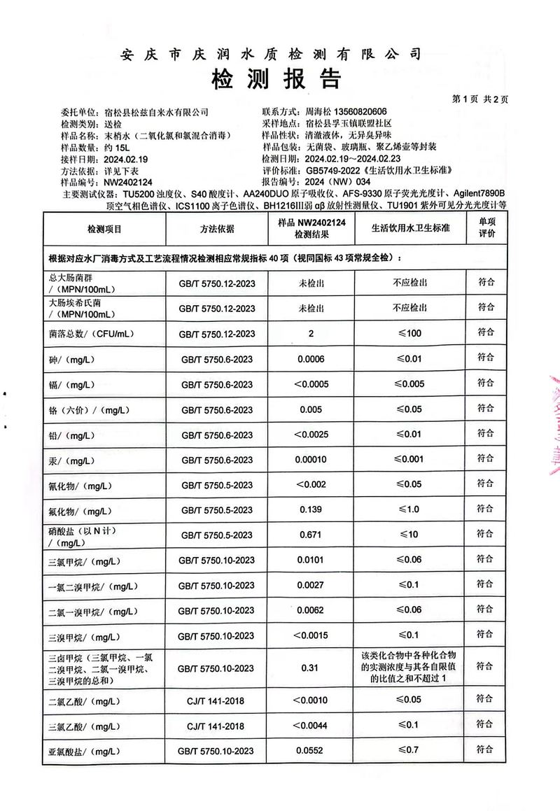 2024年2月份末梢水常规43项水质检测公告