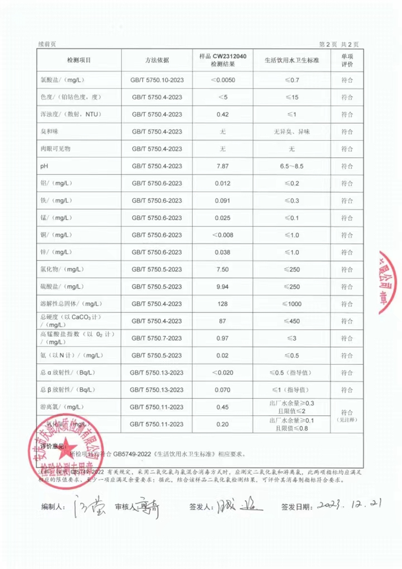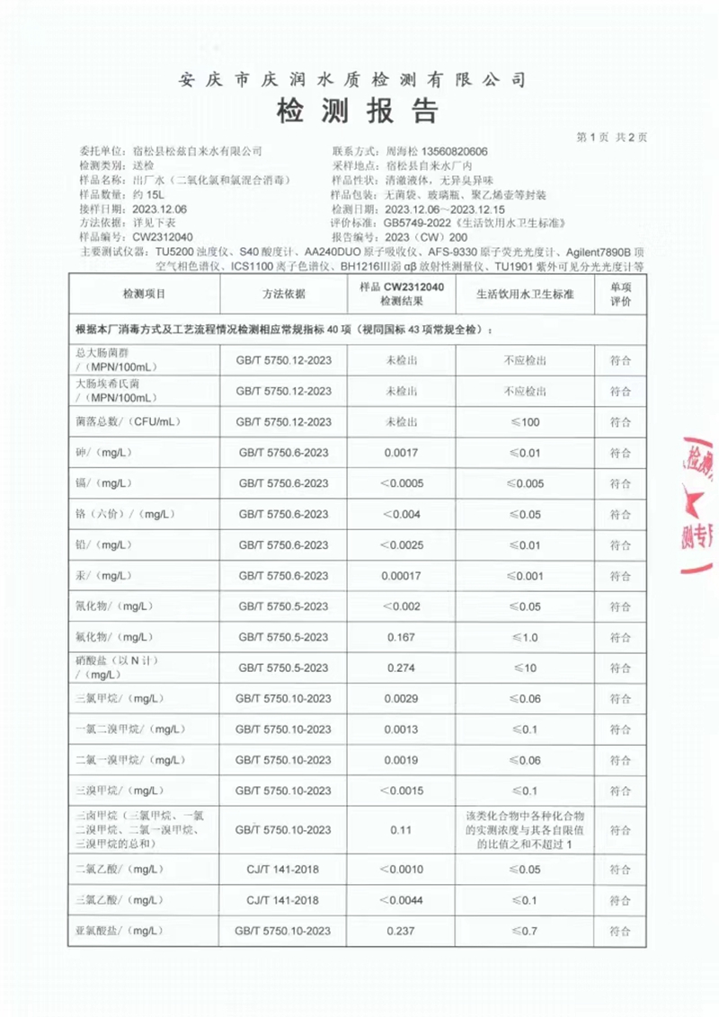 2023年12月下半月末梢水(管网13项)水质检测公告