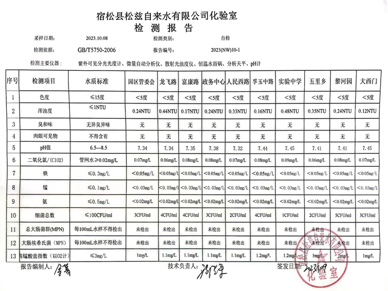 2023年10月上半月末梢水(管网13项)水质检测公告