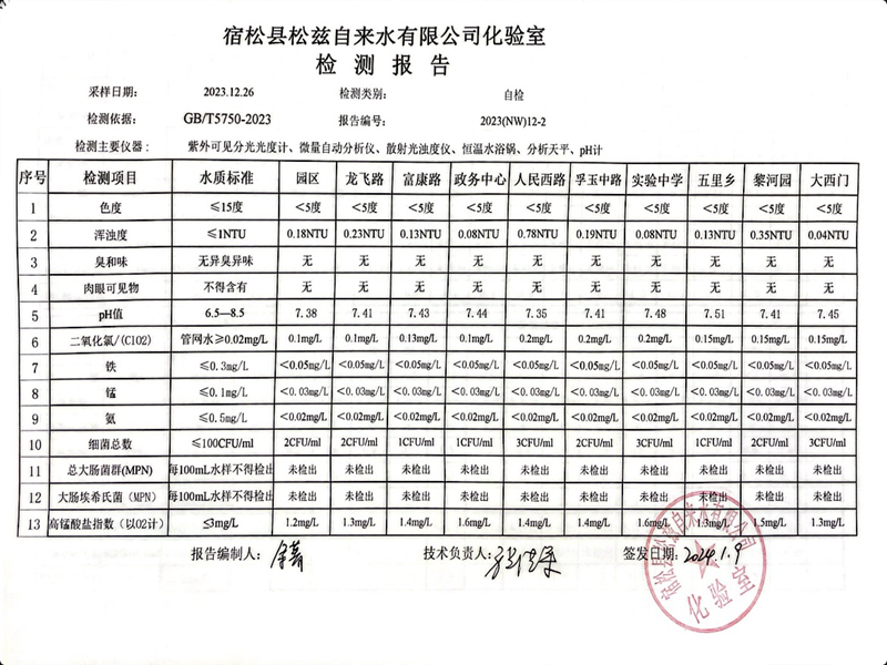2023年12月下半月末梢水(管网13项)水质检测公告