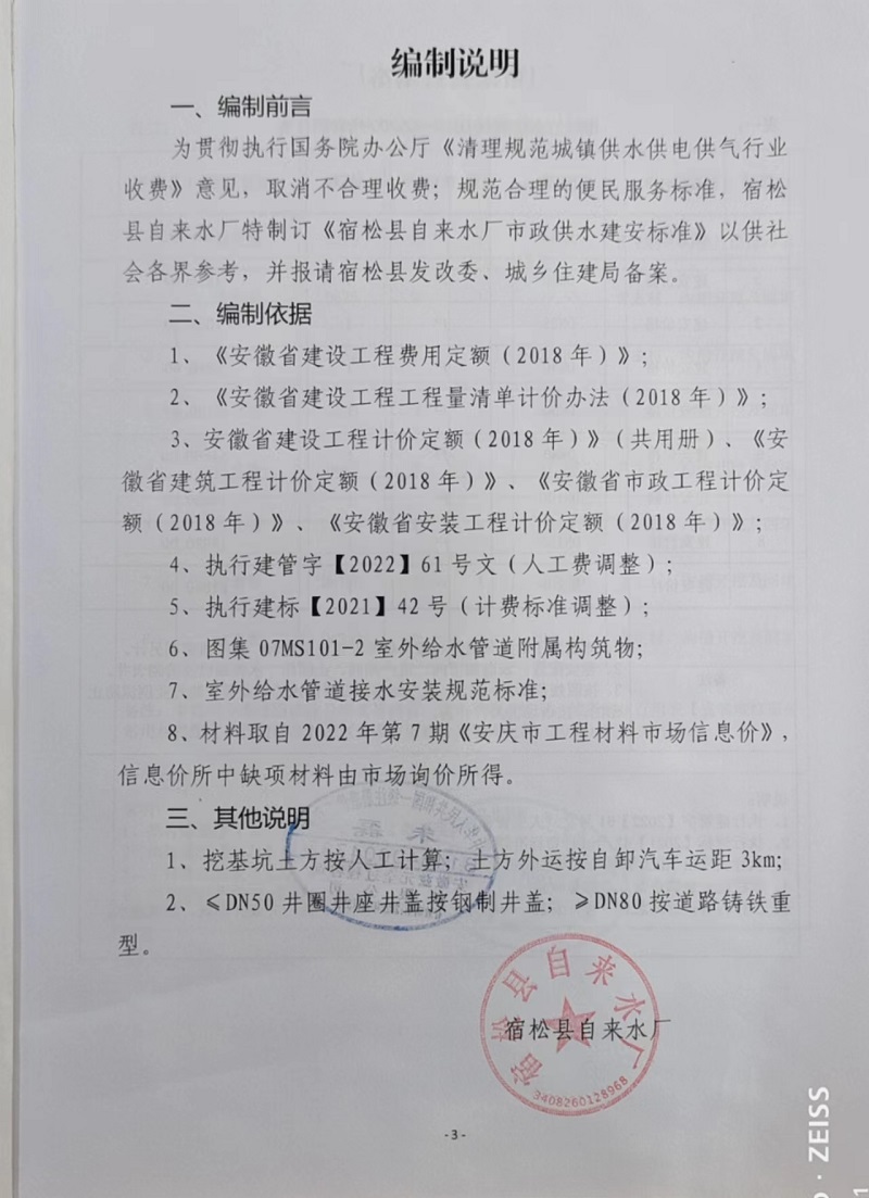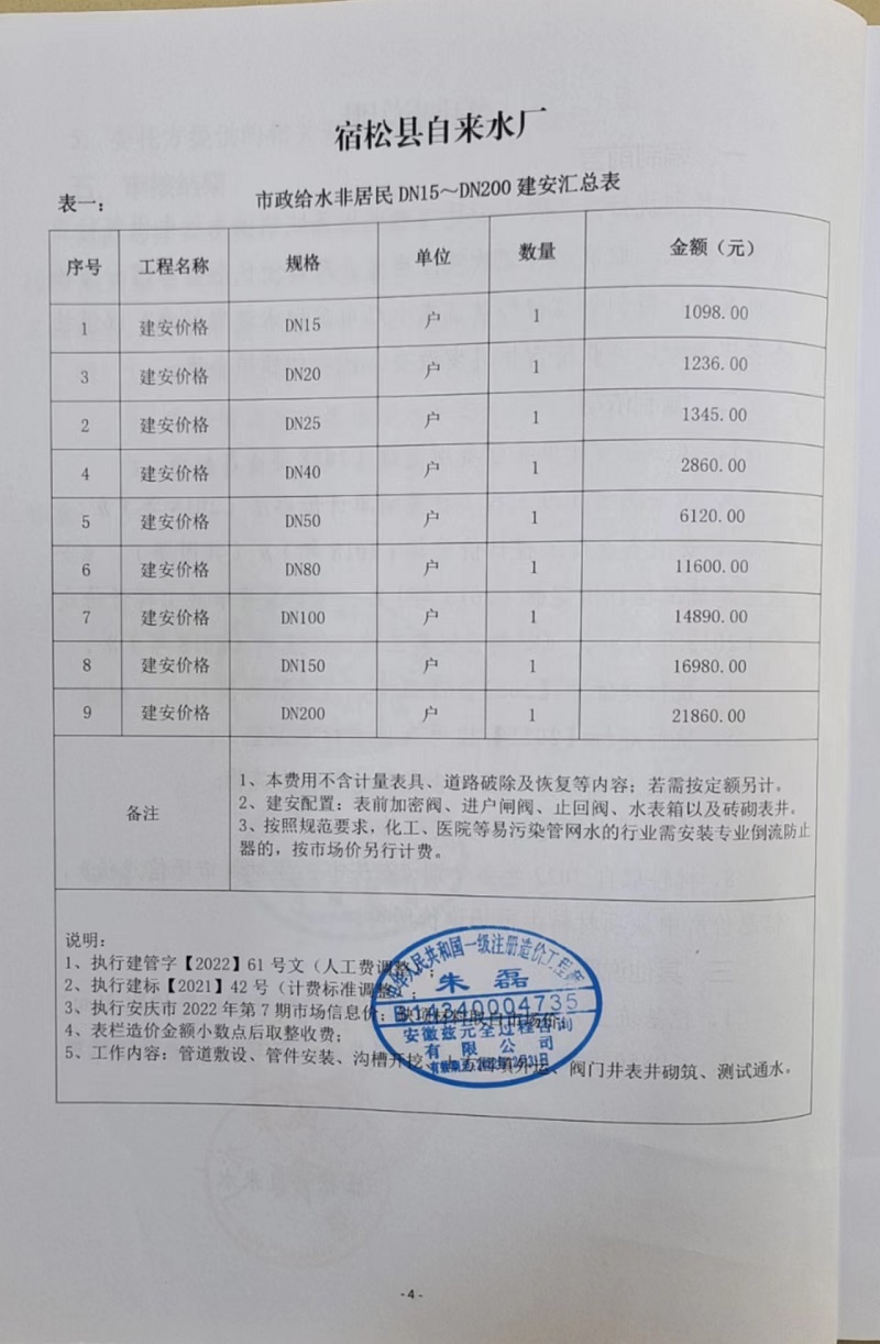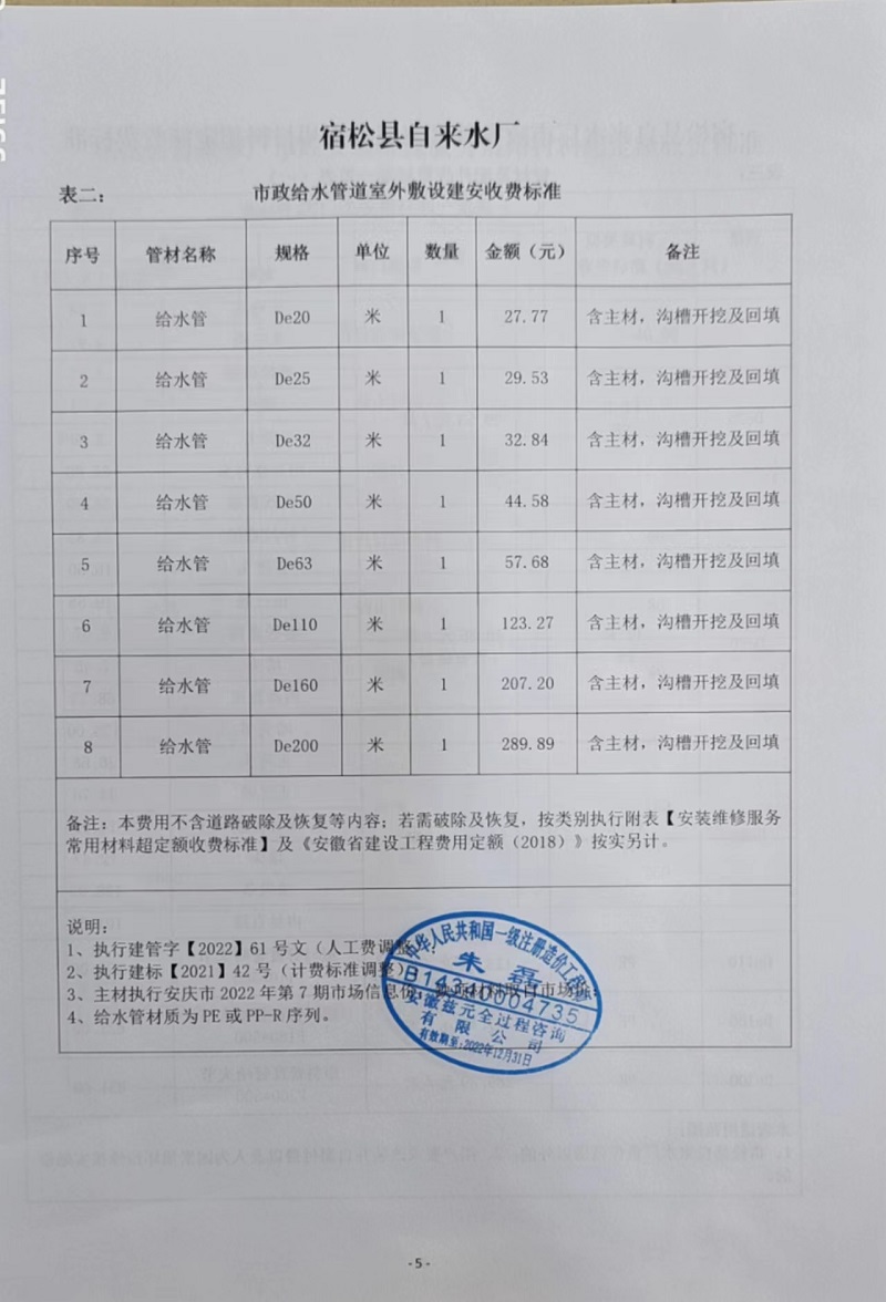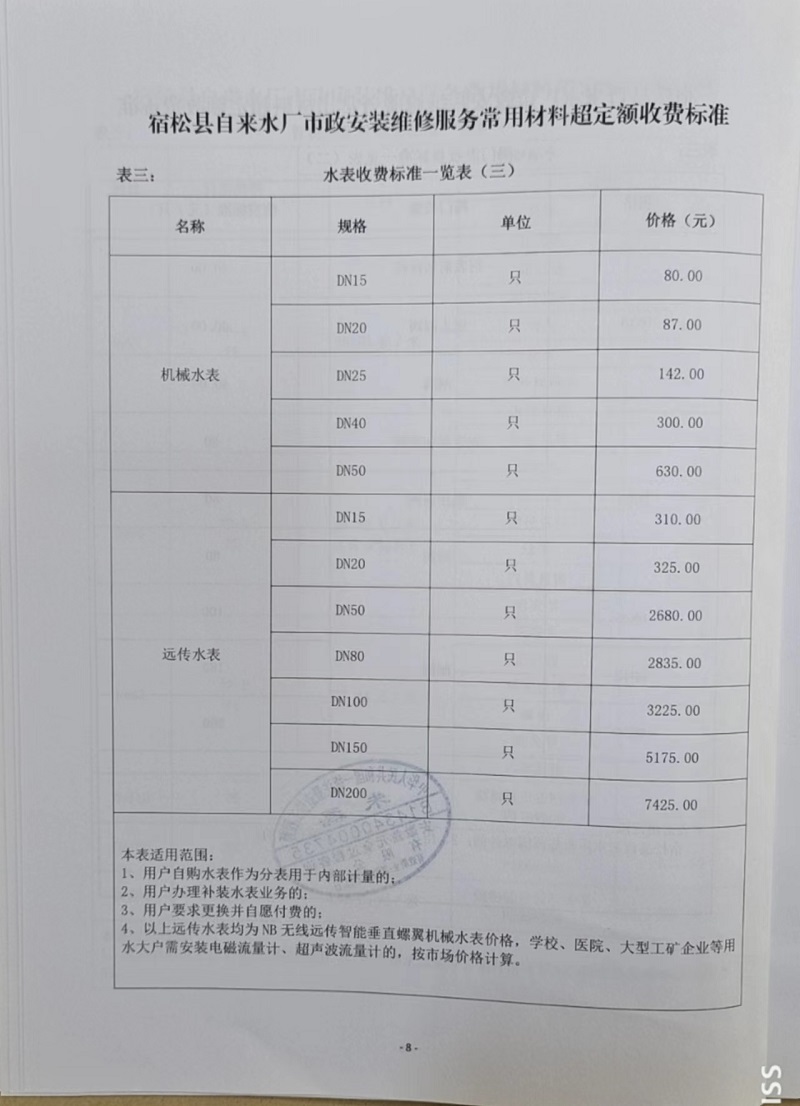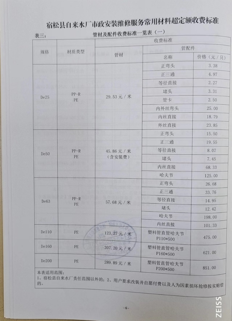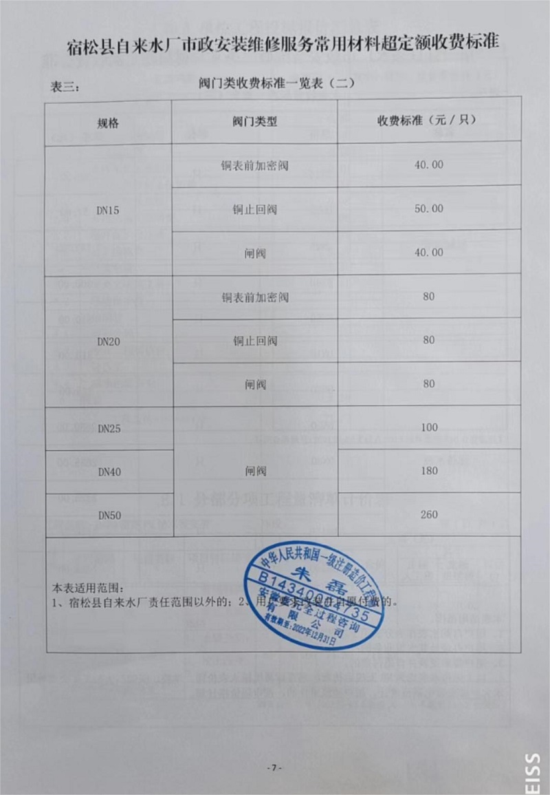 市政供水建安标准及安装维修服务常用材料超定额收费标准公示